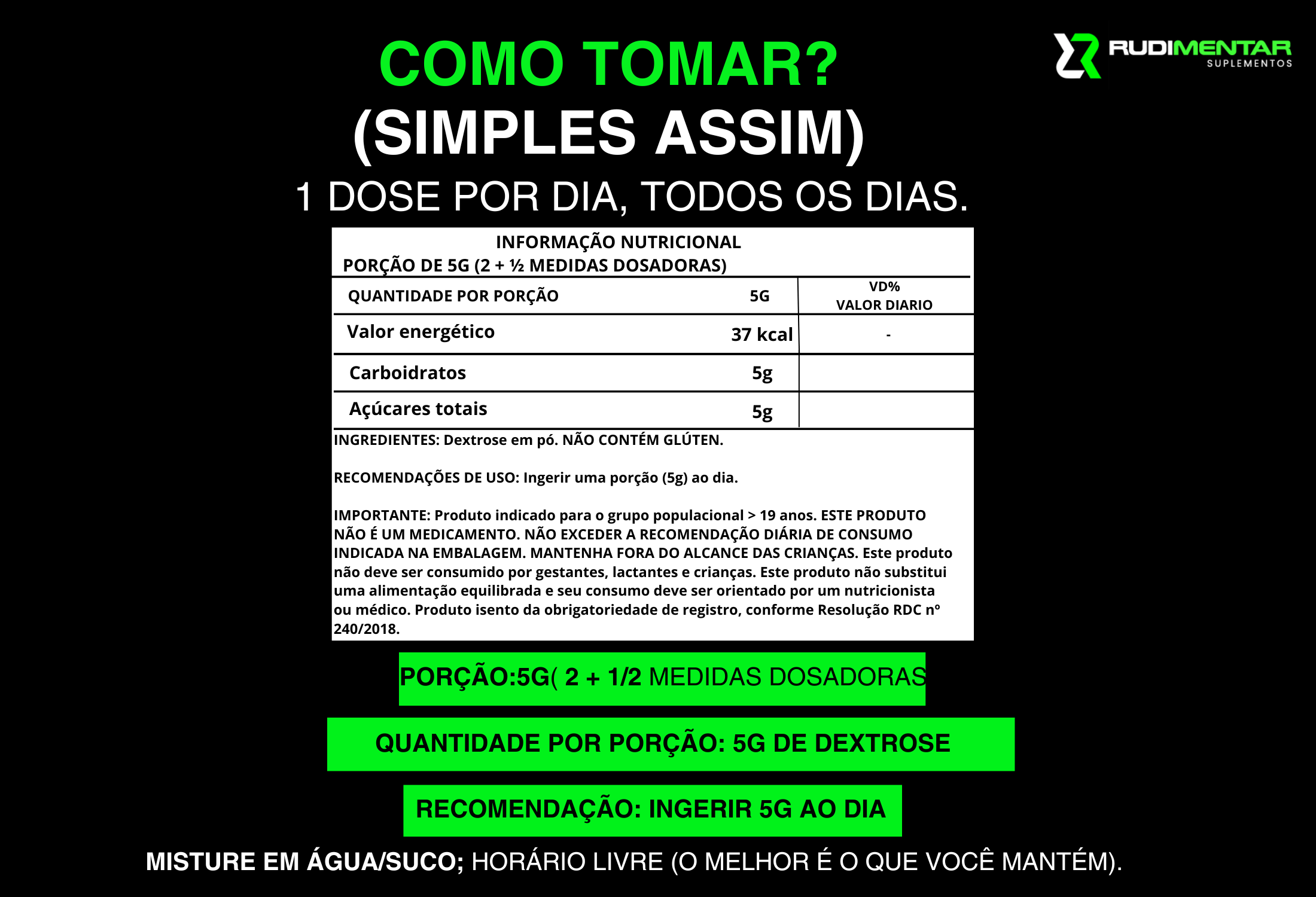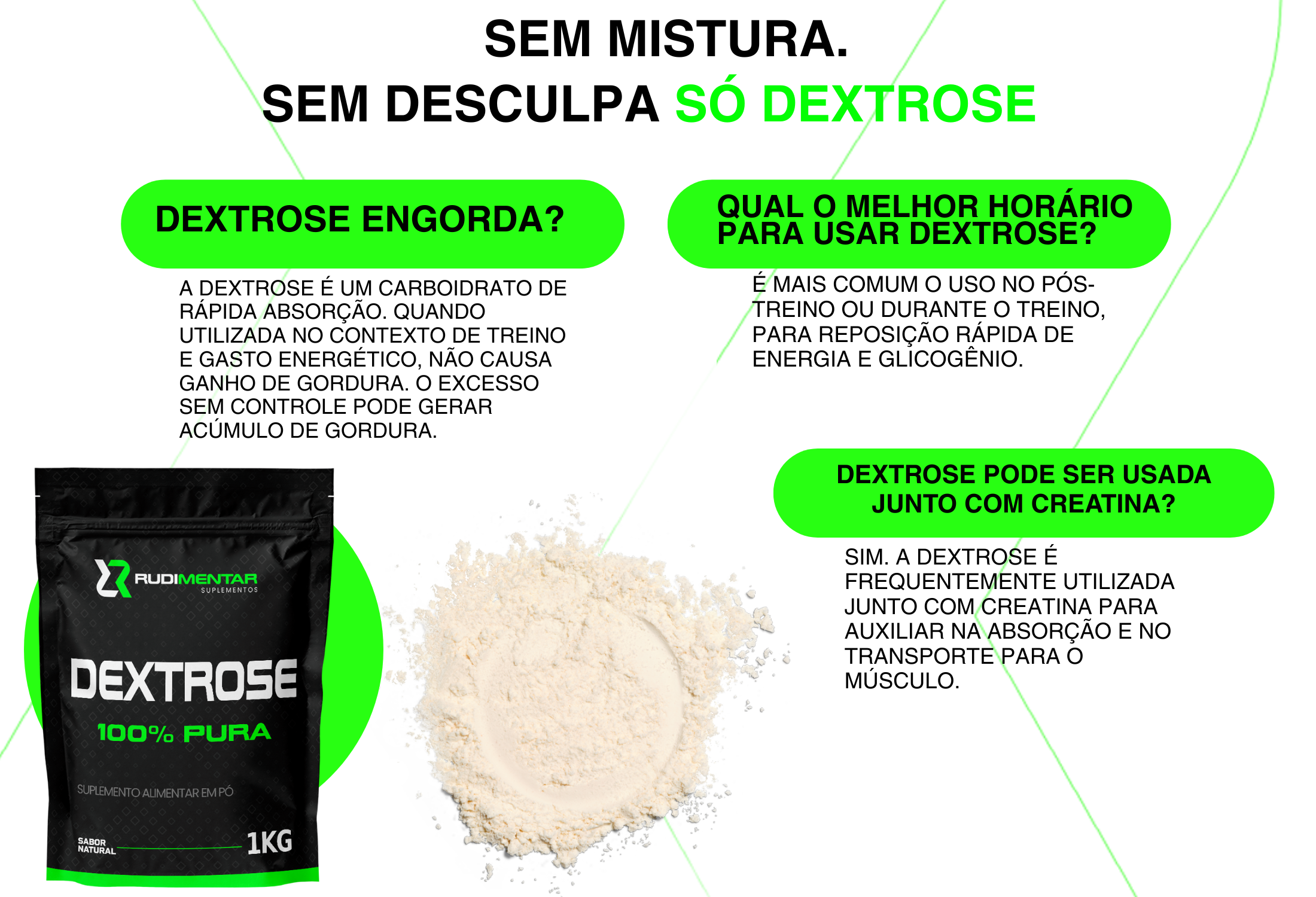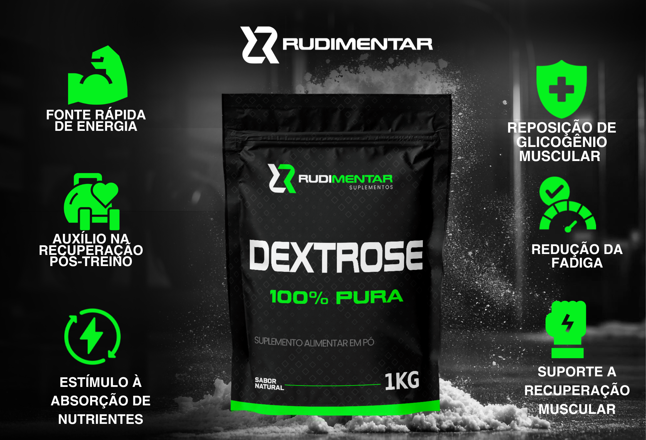 A dextrose é um carboidrato simples de absorção extremamente rápida, utilizada para fornecer energia imediata e repor o glicogênio muscular após treinos intensos.