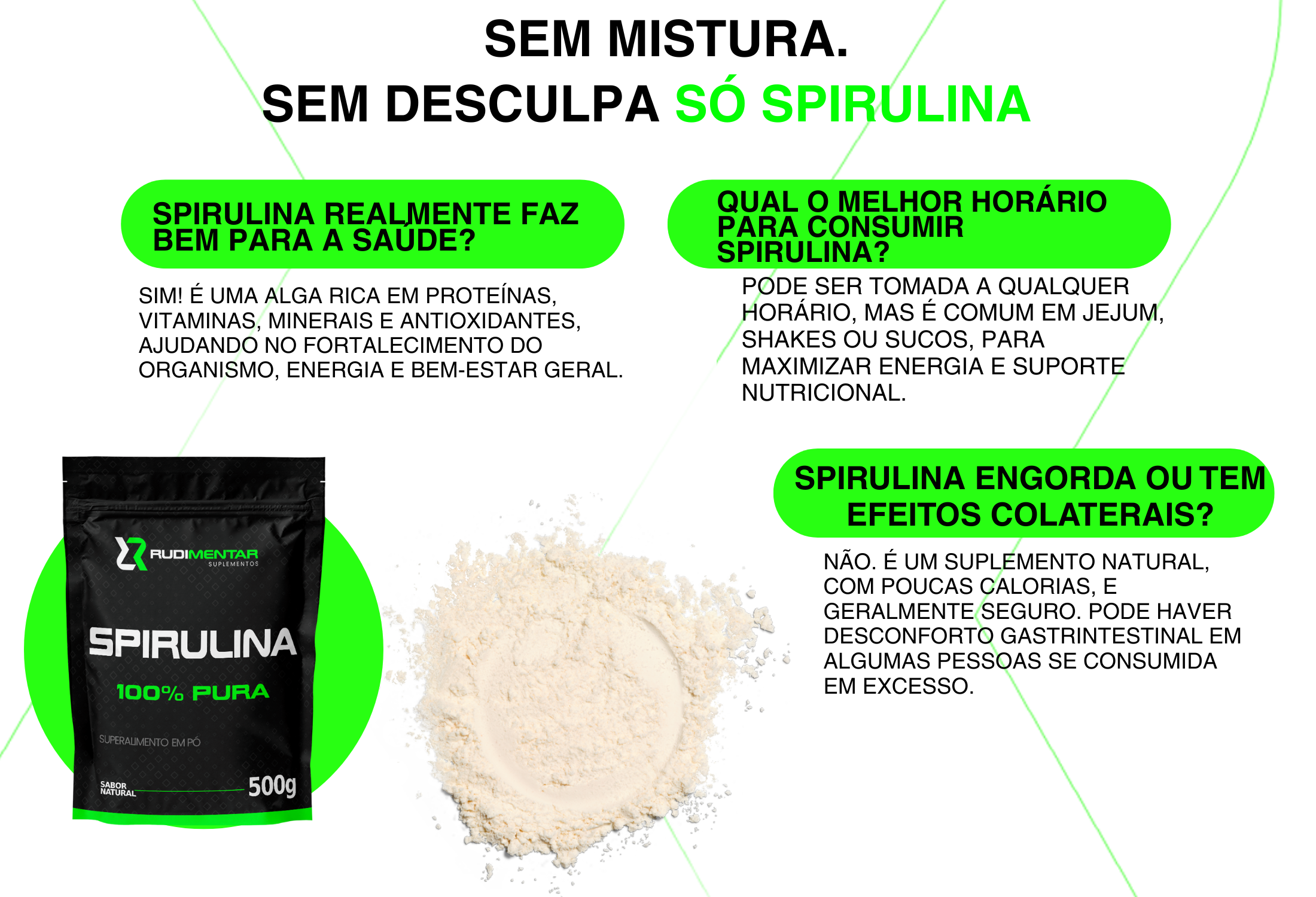 A spirulina é uma alga rica em proteínas, vitaminas, minerais e antioxidantes, muito utilizada para auxiliar na imunidade, energia, desintoxicação, recuperação muscular e no bem-estar geral.